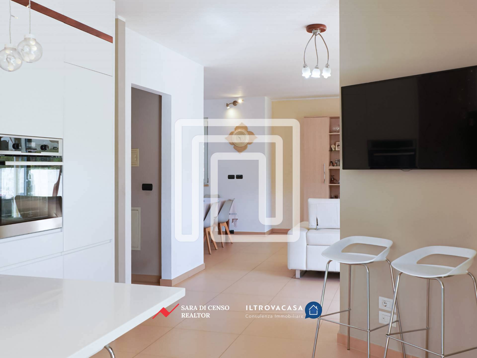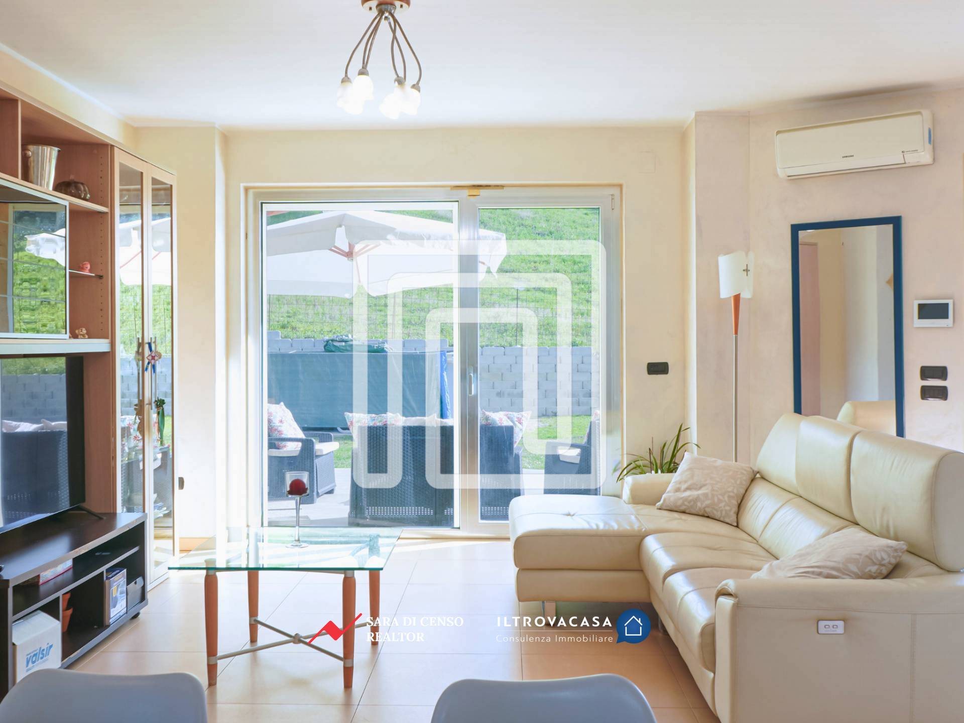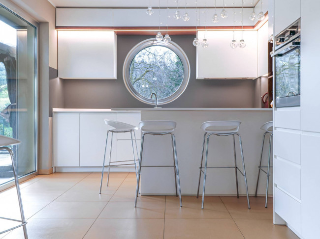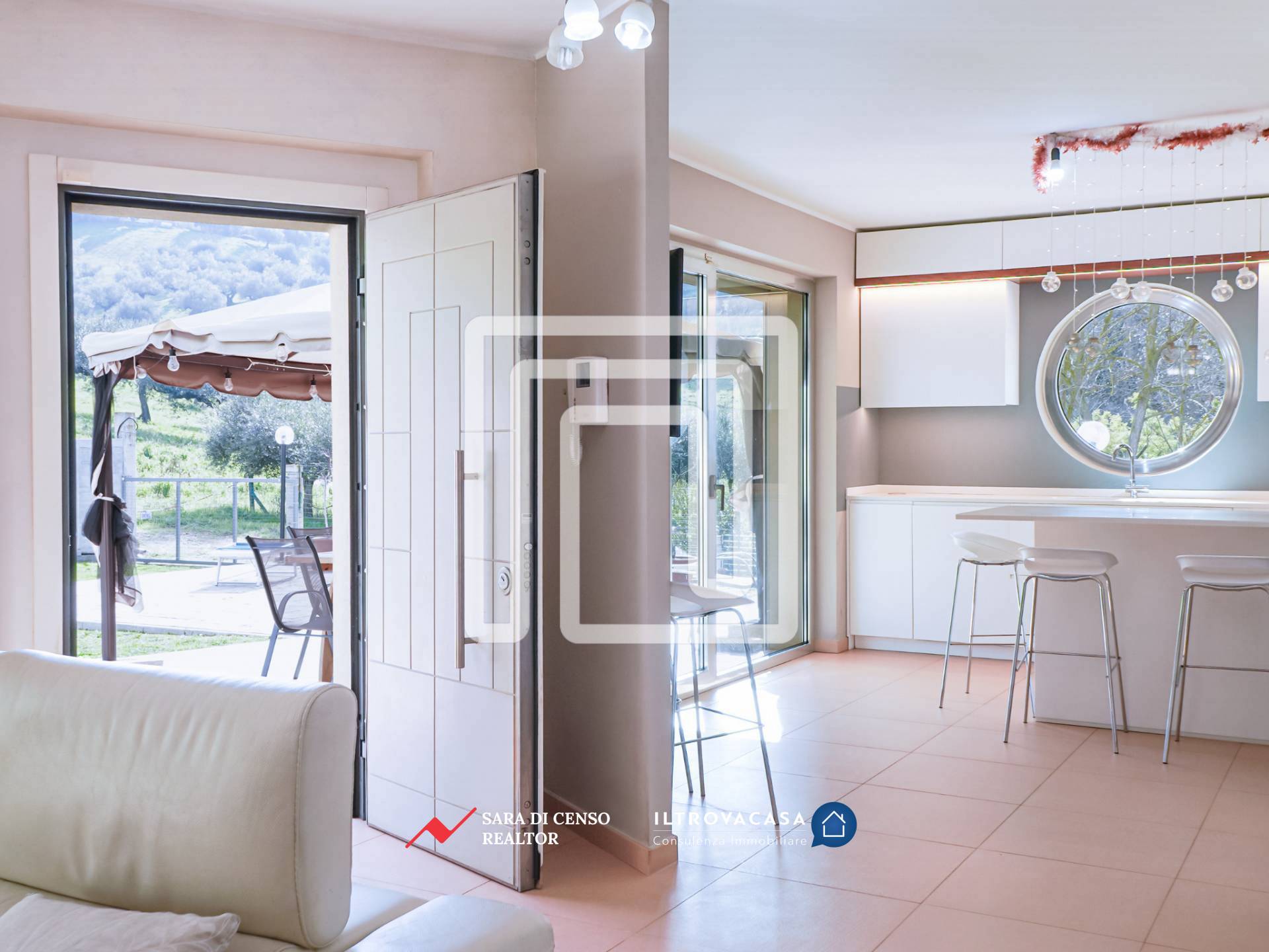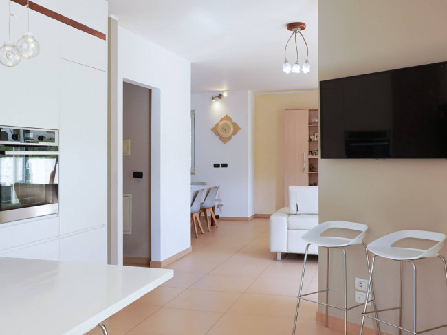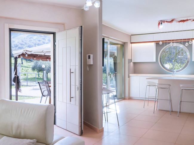 L’accesso principale avviene dal giardino, di circa 400 mq: attraversando un ampio patio pavimentato si entra nella zona giorno, ampia e luminosa, caratterizzata da un ambiente relax con grande spazio per la zona TV. In continuità si apre la zona living dedicata a pranzi e cene, mentre la cucina abitabile dialoga con l’esterno attraverso un’estesa vetrata affacciata sul verde, valorizzata anche da un particolare oblò che regala ulteriore luce e prospettiva. L’intera zona giorno, di circa 50 mq, è esposta a sud: questo garantisce luminosità per gran parte della giornata e permette di sfruttare l’irraggiamento solare, riducendo l’utilizzo del riscaldamento durante l’inverno.