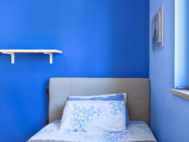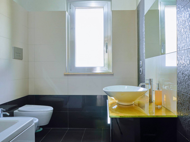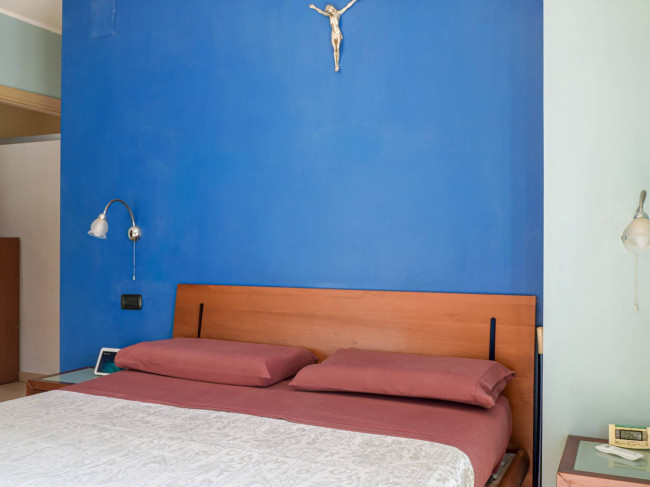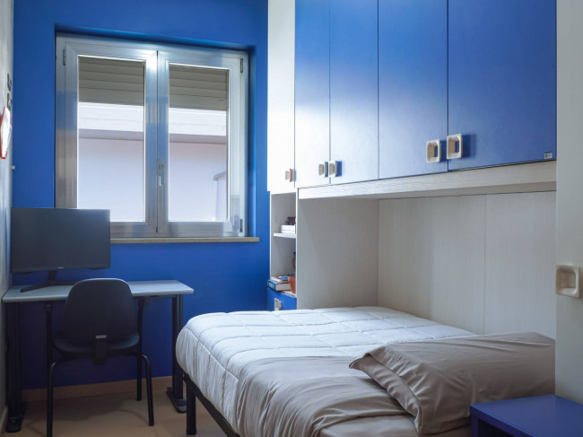 La zona notte è composta da tre camere da letto, tra cui una matrimoniale padronale con bagno privato e accesso a un ampio balcone di oltre 20 mq. È presente inoltre un secondo bagno a servizio delle altre camere e della zona giorno. L’immobile è dotato di schermature solari del tipo frangisole, infissi in alluminio Schüco e soluzioni pensate per il massimo comfort, con attenzione anche all’eliminazione delle barriere architettoniche.